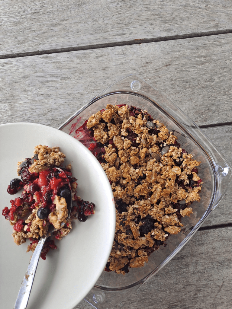 Op zondag eet ik graag eens een speciaal ontbijtje. Traditiegetrouw eten wij thuis elke zondag een warm croissantje of een chocoladekoek uit de oven. Maar soms heb ik ook gewoon zin in iets anders. Deze crumble is dan de oplossing. Maak hem op zondag in een grote hoeveelheid (doe het recept als je met meerdere in huis woont x3) en geniet tijdens de week van je voorgeprepte ontbijtje. Lekker, voedzaam en goed vullend met een portie yoghurt, platte kaas of skyr. Een ontbijtje waarbij mentale en fysieke verzadiging elkaar ontmoeten. Mijn cliënten zullen wel begrijpen wat ik bedoel ;). Smakelijk!